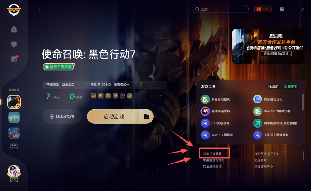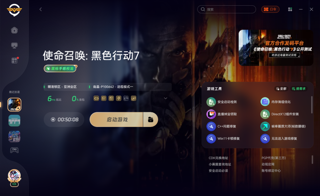 可以使用奇游,加速一下《使命召唤黑色行动7》然后重启游戏就可以正常进入了。