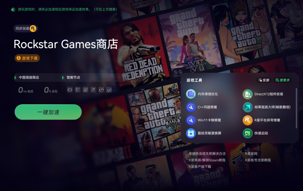 针对账号登录问题,奇游加速工具还提供了专门的异常修复工具。玩家点击运行该工具,就可以对平台进行全面的检测与修复。修复完成后,重新启动R星平台,往往能够解决因平台异常导致的账号登录障碍。