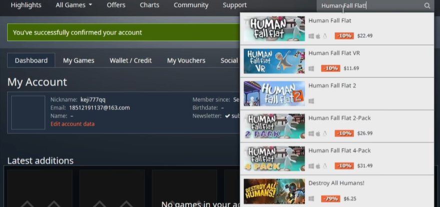 进入活动界面在右上角搜索人类一败涂地的英文名,复制搜索结果。等活动页面刷新后,会出现一个优惠券,价格变为零点。