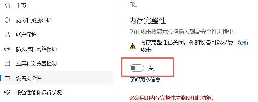 • 在 “设备和安全性” 中找到 “内核隔离详细信息”,关闭 “内核完整性” 选项。