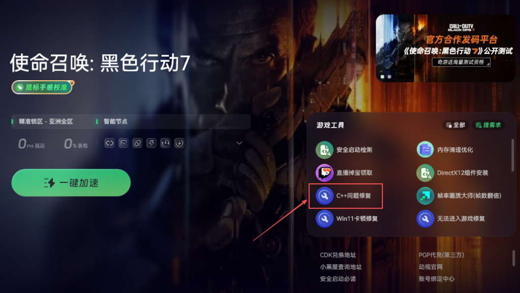在打开COD22过程中,打开奇游,搜索”COD22″。优化电脑本地网络的环境,从而解决因网络问题导致的COD22黑屏、DX12报错、C++报错、无法登陆等情况,顺利解决问题。