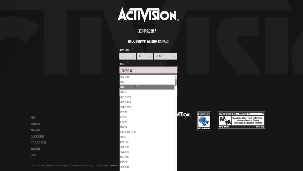 注册时需要填写生日(记得选成年日期),选好地区,再绑定你的邮箱,最后设置一下动视账号的昵称和密码就行了。