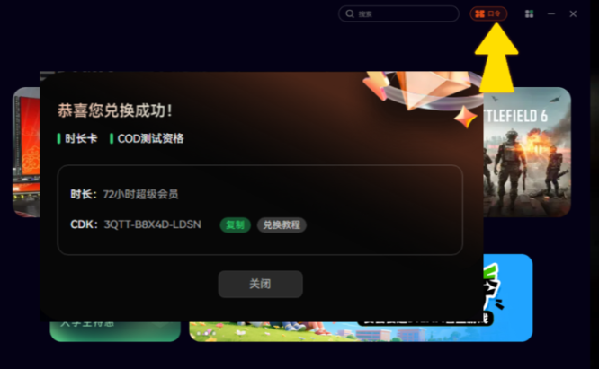 领完CDK,搜索“COD22”并开启加速。加速成功后,加速页面上通常会有一个“测试资格兑换教程”的入口,点进去就能跳转到官方的兑换页面。