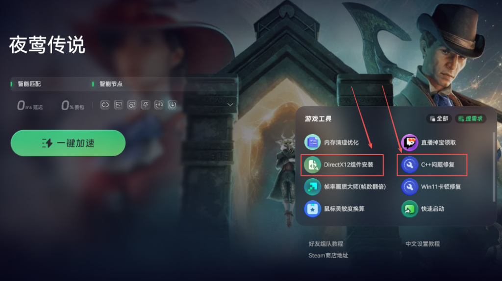 另外还有两种报错提示,一般是关于DX12或C++组件的。这两种情况也不用慌,回到奇游加速的《夜莺传说》加速页面,通常都能找到相应的运行库组件下载链接。点一下就会跳转到浏览器开始下载,把这两个组件安装好,问题基本就解决了。