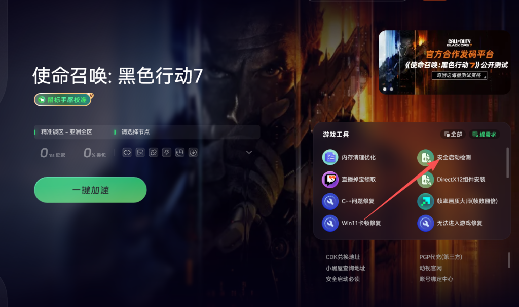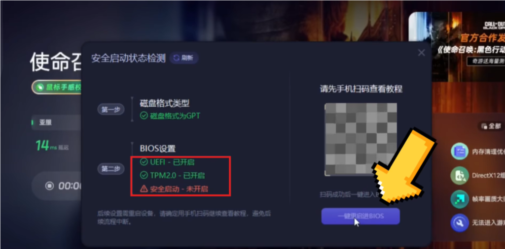 获取激活码后玩家需在相应平台进行兑换并激活游戏。进入游戏界面后,点击安全启动检测选项,系统将自动进行检测。若检测到安全启动未开启,系统将提示玩家进行快捷设置。
