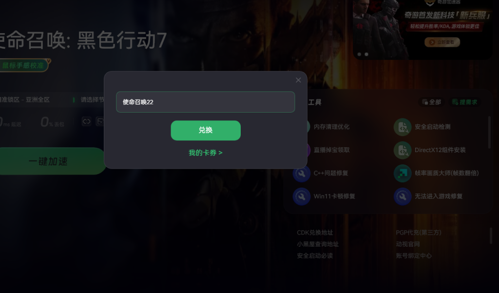 随后再次使用奇游搜索COD22并加速,点击右侧的CDK兑换地址。