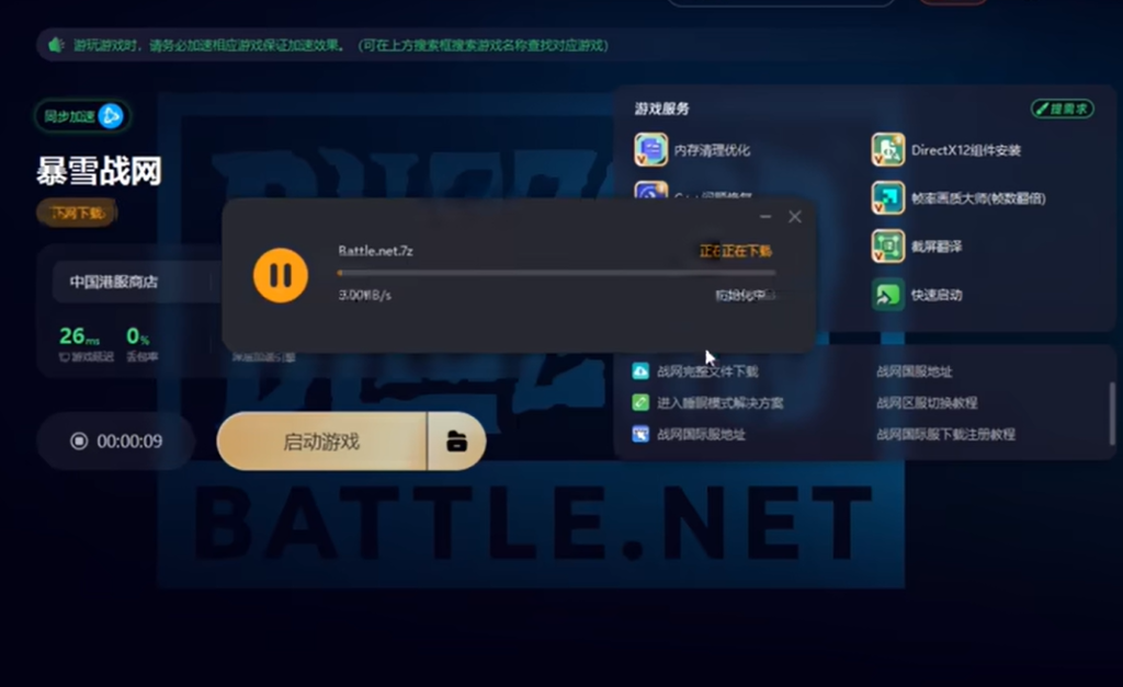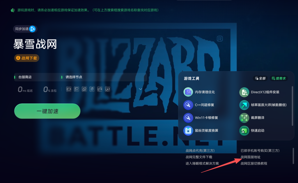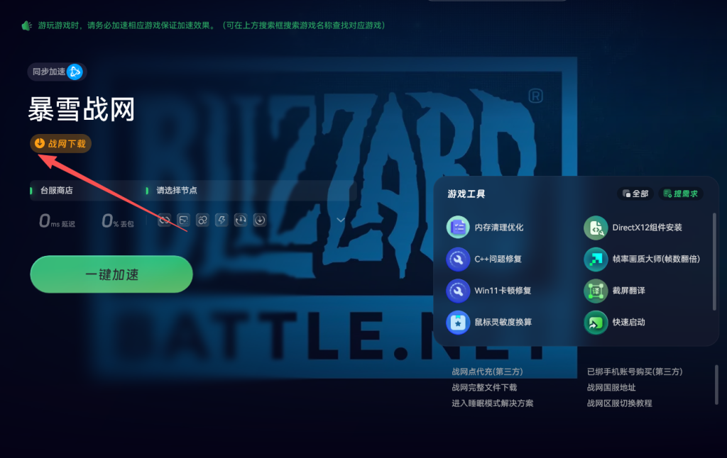 接下来进行战网的下载与注册。使用奇游搜索暴雪战网进行加速。加速完成后点击左侧的一键下载按钮开始下载战网客户端。