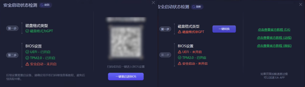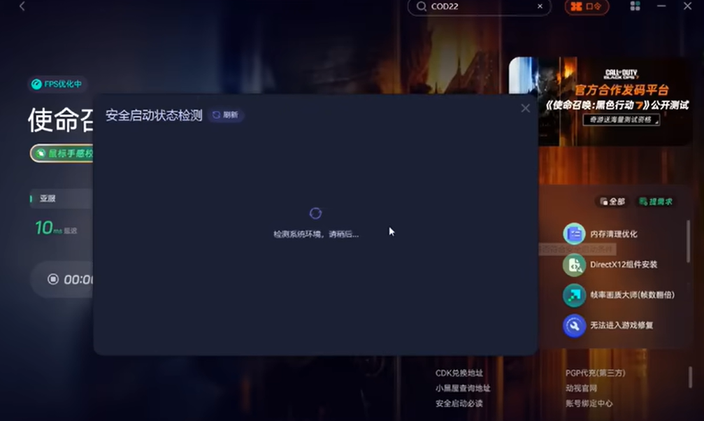 完成加速后,点击奇游加速工具右侧的“安全启动检测工具”。这个工具十分智能,它会依据安全模式所需开启的项目进行全面检测。一旦检测出存在问题,相关项目会直接以红色字体标注出来,让玩家一目了然。