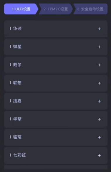 后面几步都得进BIOS里设置。不同品牌的主板,BIOS界面和选项位置不太一样,有点麻烦。不过好在刚才提到的工具里有各品牌主板的详细设置指南,不管是UEFI设置、TPM 2.0开启,还是安全启动选项,里面都有对应的图文教程。