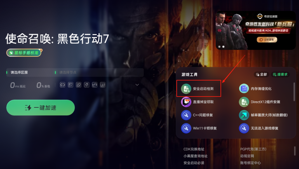 打开奇游这样的网络加速工具,搜索“《使命召唤22》”并进行加速,优化电脑本地的网络环境。这不仅能提升游戏连接速度,减少延迟和丢包,有时也能解决因网络验证失败而导致的“未启用Secure Boot”等报错情况,让游戏启动过程更加顺畅。