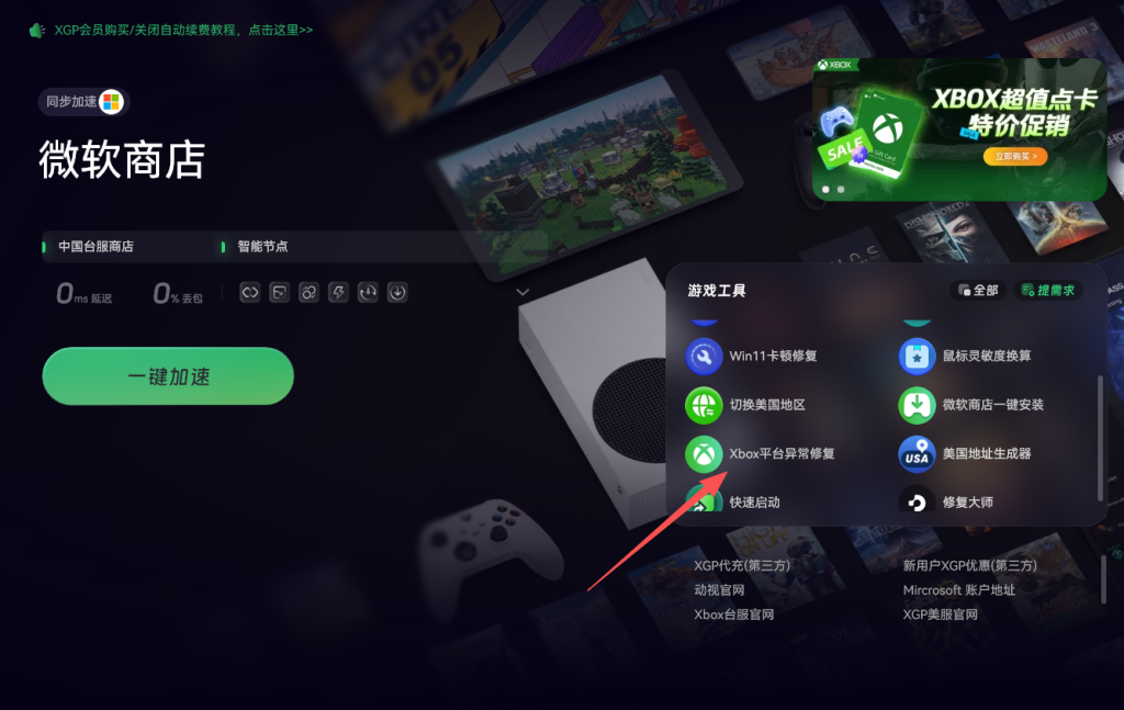 对于XGP版本的玩家,有时会遇到登录黑屏或提示未登录档案的情况,这实际上是客户端的已知bug。玩家可以先卸载XBOX应用,然后使用奇游加速工具搜索XBOX加速,找到并点击下方的下载异常修复功能,解决登录问题。