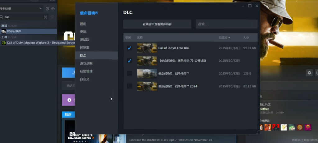 在Steam库中找到“使命召唤”系列游戏,点进去看DLC项目,勾选“黑色行动7公开试玩”这个选项,其他内容不用下载。