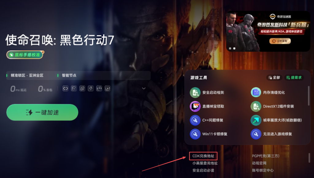 首先,你需要准备一个加速工具,比如奇游。打开之后,在指定的兑换框里输入“使命召唤22”这个口令,就能拿到测试用的CDK码,有时还能顺便领到一些免费加速时长。
