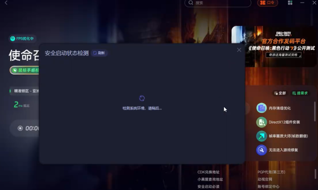 完成资格获取后,玩家需要使用奇游加速工具对COD22进行网络优化,确保游戏运行流畅。优化完毕后,在游戏工具菜单中,玩家可以轻松找到“安全启动检测”选项。点击该选项后,系统将自动进行检测。
