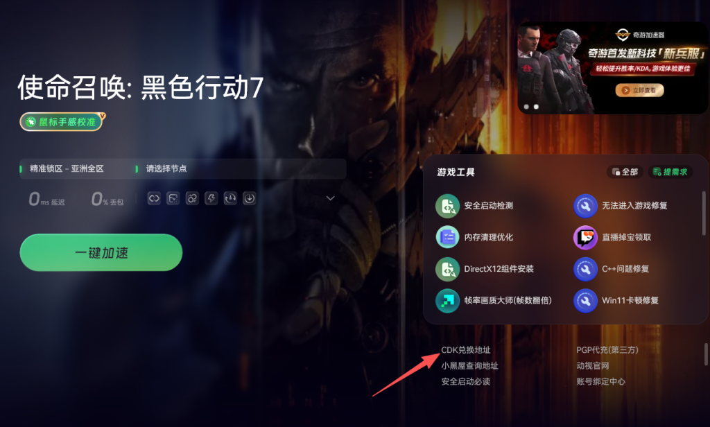 首先玩家需要准备一个奇游加速工具。打开工具后,在右上角的口令输入区域输入使命召唤22直接获取一个激活CDK。这个CDK需要前往官方网站进行兑换。