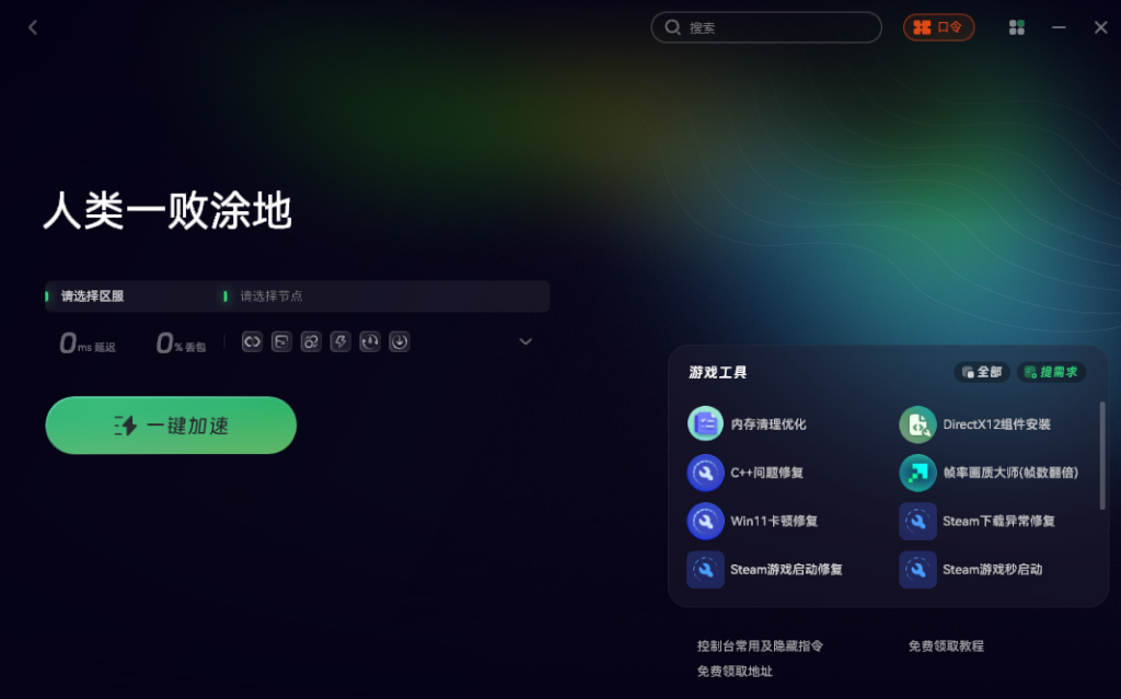 首先,打开奇游加速工具,搜索找到《人类一败涂地》的游戏界面,在右上角你会看到一个“口令”功能,在里面输入“steam400”,就能拿到一个外区账号,这是后续步骤需要用到的。