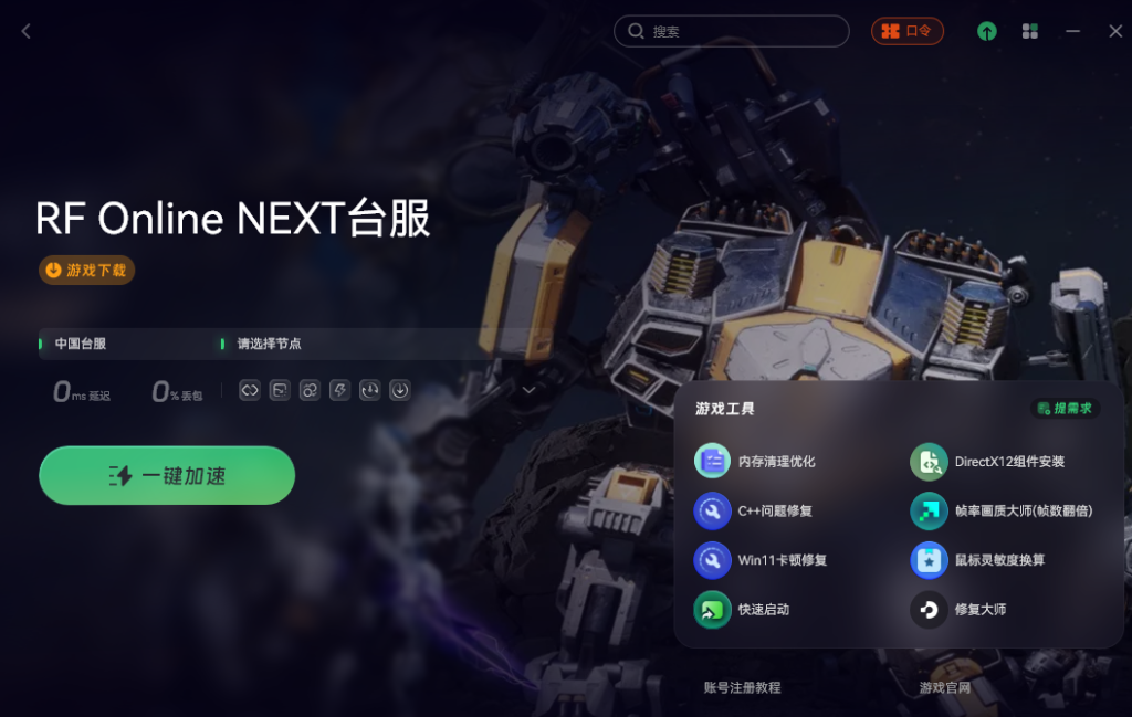 第一步,准备工作很关键。因为玩的是外服,网络环境得先弄好。建议你提前准备一个网络加速工具,比如用“奇游”,在搜索框里直接输入“RF Online Next台服”,然后点一键加速。这样能优化网络,后面下载和玩游戏都会顺畅很多,不容易卡顿或掉线。