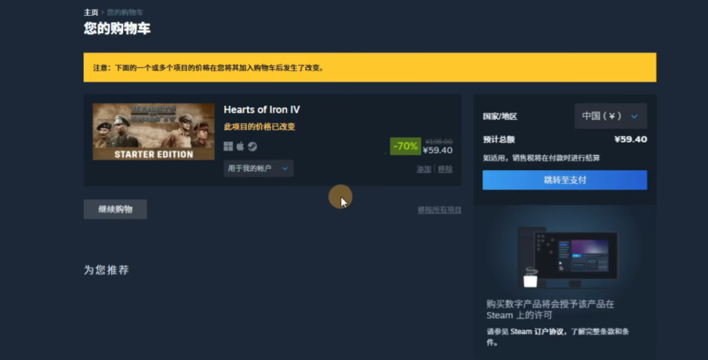 重新进商店页面,搜索“钢铁雄心4”,把它加到购物车。接着点右边那个蓝色的支付按钮,这时候可能会再让你登录一次Steam账号。你就正常登录自己常用的国服账号,登上去之后,应该就能看到游戏价格变成人民币59元了。