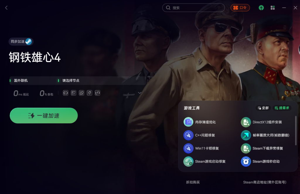 第一步,最好先开一个加速工具。这里用“奇游”举个例子,打开之后直接搜“钢铁雄心4”,选一个适合的区服进行加速。这样后面操作会顺畅不少,不容易卡页面或者报错。