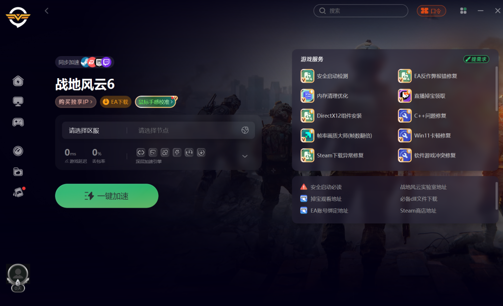 首先是网络优化,奇游加速器能解决链路问题。跨服网络丢包常导致卡顿与闪退,奇游加速器可针对性优化 EA 服务器连接。玩家安装登录后,搜索 “战地 6 专属加速”,选择延迟低于 40ms、丢包率低于 1% 的国内专线节点,点击 “启动加速”,显示成功后再通过 EA App 启动游戏,且在右上角输入 “qy666” 可获取 3 天会员。