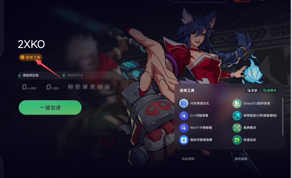 由于游戏服务器部署于海外,国内玩家需通过网络优化工具提升连接稳定性。推荐玩家们使用奇游加速工具,在奇游搜索2XKO后选择日本节点进行加速。完成网络优化后,通过加速界面内置的游戏下载入口获取客户端安装包。