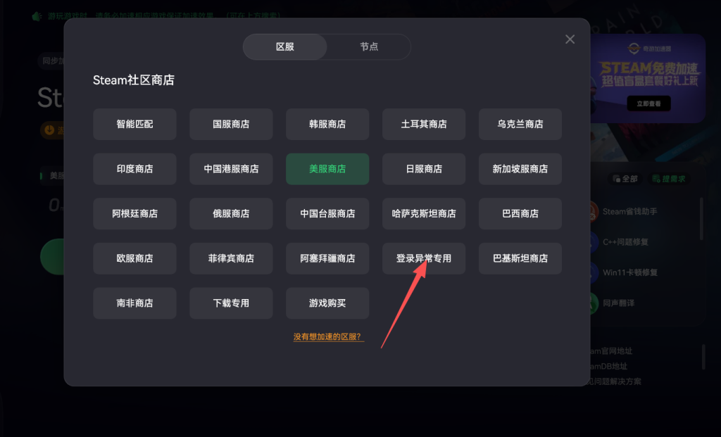 对于Steam登录异常的问题,玩家可以使用奇游加速器的Steam登录异常专用节点。这些节点经过特别优化,能够针对Steam商店的登录问题进行精准解决,帮助玩家顺利登录并访问商店页面。