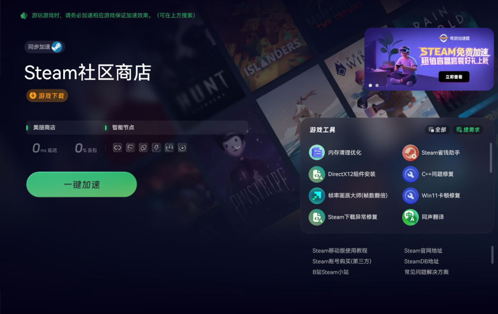 由于Steam服务器不在国内,国内玩家在访问时可能会遇到各类网络问题,导致商店无法登录或页面加载缓慢。玩家们可以使用奇游加速工具来改善网络连接,解决因网络问题导致的Steam商店访问障碍。