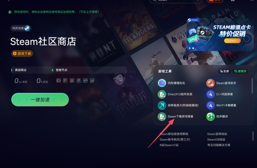 如果上述方法仍无法解决问题,玩家还可以使用奇游加速工具的Steam平台修复工具。自动检测并修复Steam商店可能存在的各类问题,包括无法登录、页面加载失败等,帮助玩家快速恢复正常的购物体验。