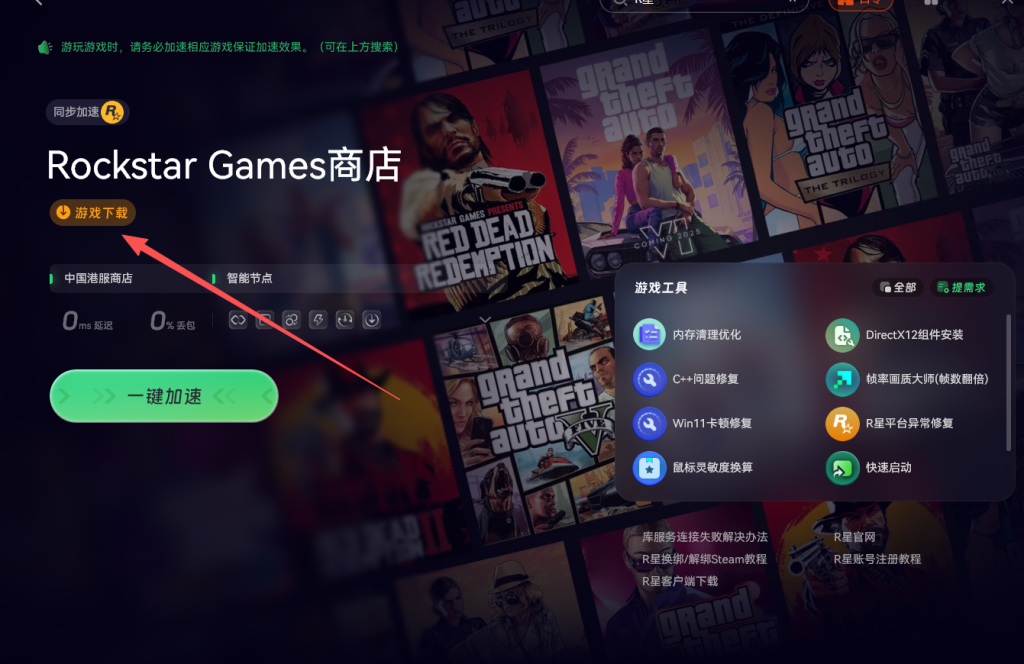 如果上述方法仍无法解决问题,玩家可以使用奇游加速工具中的游戏下载功能,重新下载R星平台。确保下载的客户端文件完整且未受损,从而解决因文件问题导致的平台无法登录或请求处理失败。
