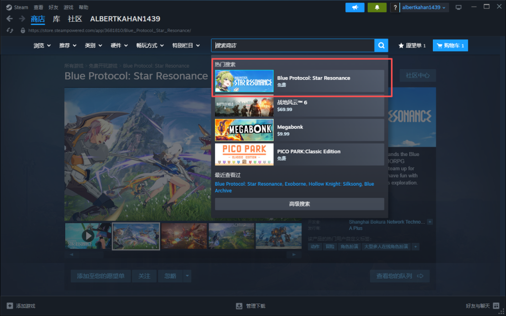 在Steam商店直接搜索游戏名这个blue 就可以看到游戏