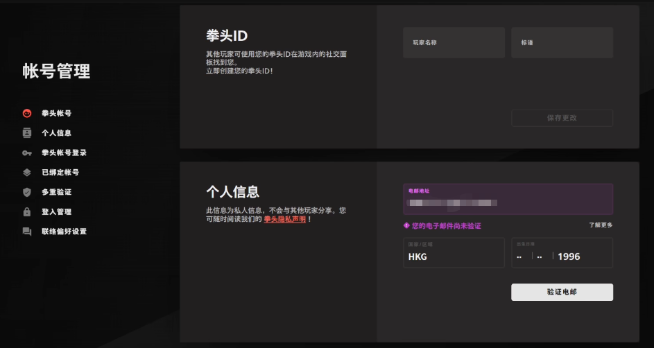 打开拳头的客户端,右上角头像,账号资讯。在拳头账号右边的地区中,检查一下账号所在的地方,账号需要是港区马来日区的才能进行游玩。如果不是的话,需要重新注册一下账号,需要注意美测服的账号也无法进行游玩。
