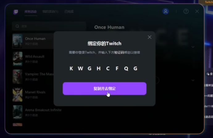 在奇游的直播掉宝工具那边,右侧有个绑定选项,你先复制链接去绑定Twitch账号。