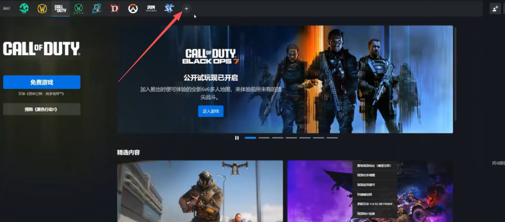 关联完成后打开战网客户端,使用注册的账号登录。在客户端界面中,仔细查找COD21的图标。如果没找到可以点击加号进行查看。找到图标后,点击免费游戏选项下载使命召唤21:黑色行动6。