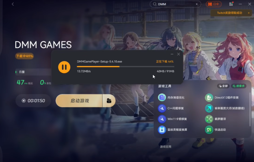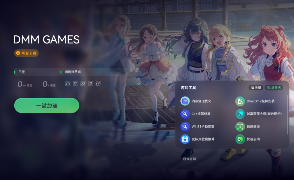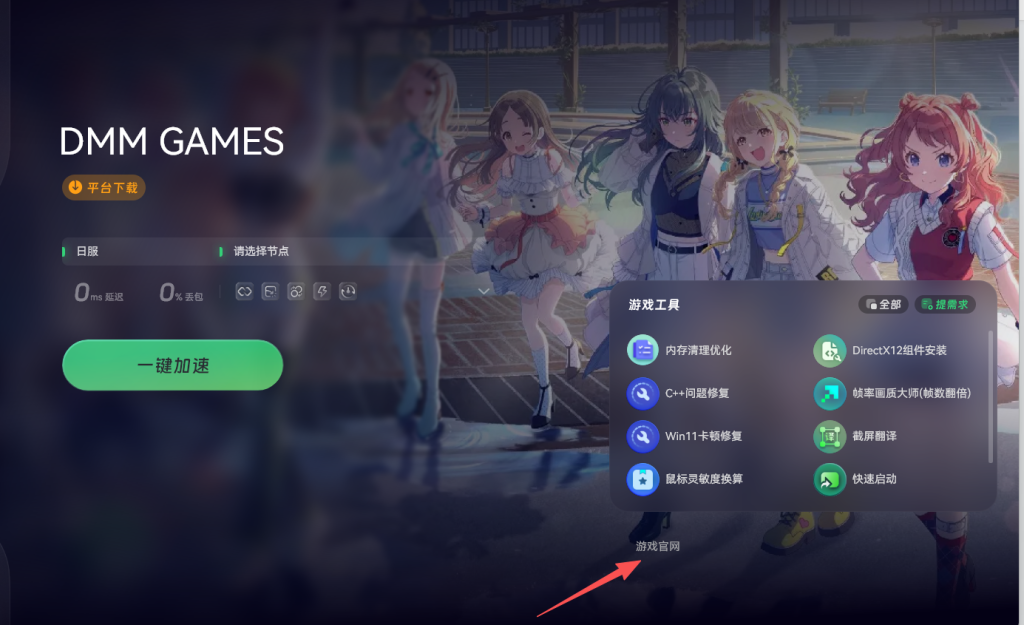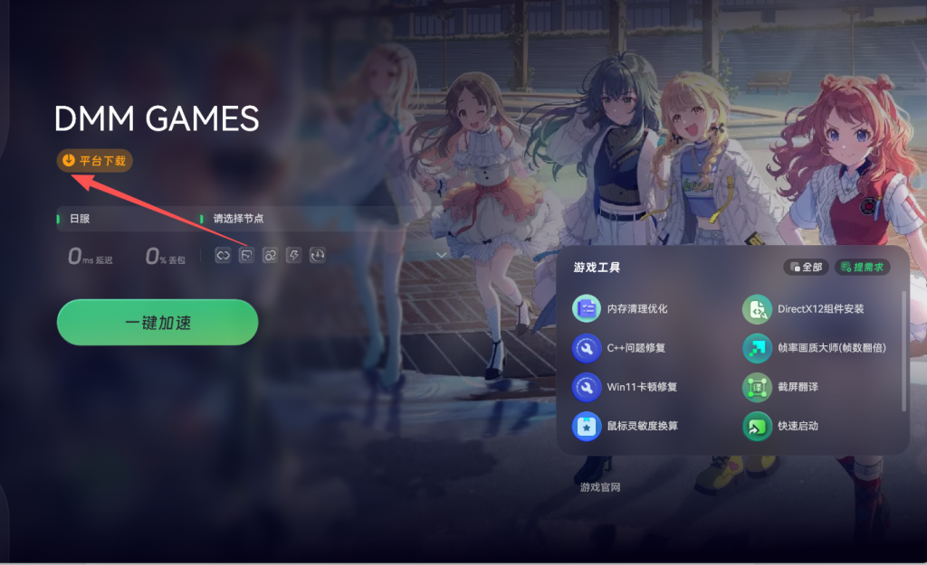 注册成功后返回奇游加速页面,点击游戏下载按钮,一键下载DMM平台客户端。