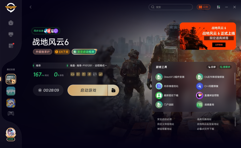 可以使用奇游,加速《战地风云6》南非节点可以正常创建门户房间。