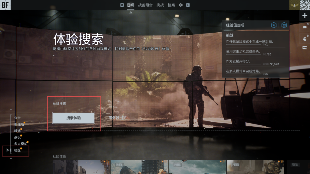 我们进入游戏,点击左侧【社区】栏中的【搜索体验】