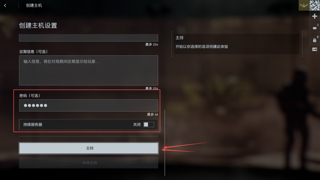 下滑输入密码并关闭持续服务器点击主持即可开始游戏。