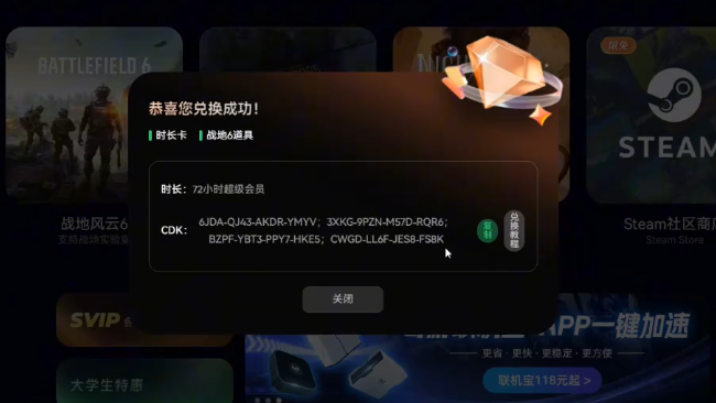 在右上角找到“口令兑换”或类似功能,输入“战地六”三个字,就能领取最多720小时的加速时长,同时也会拿到四个奖励对应的CDK兑换码。