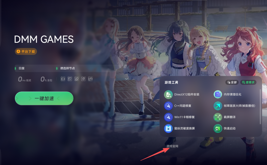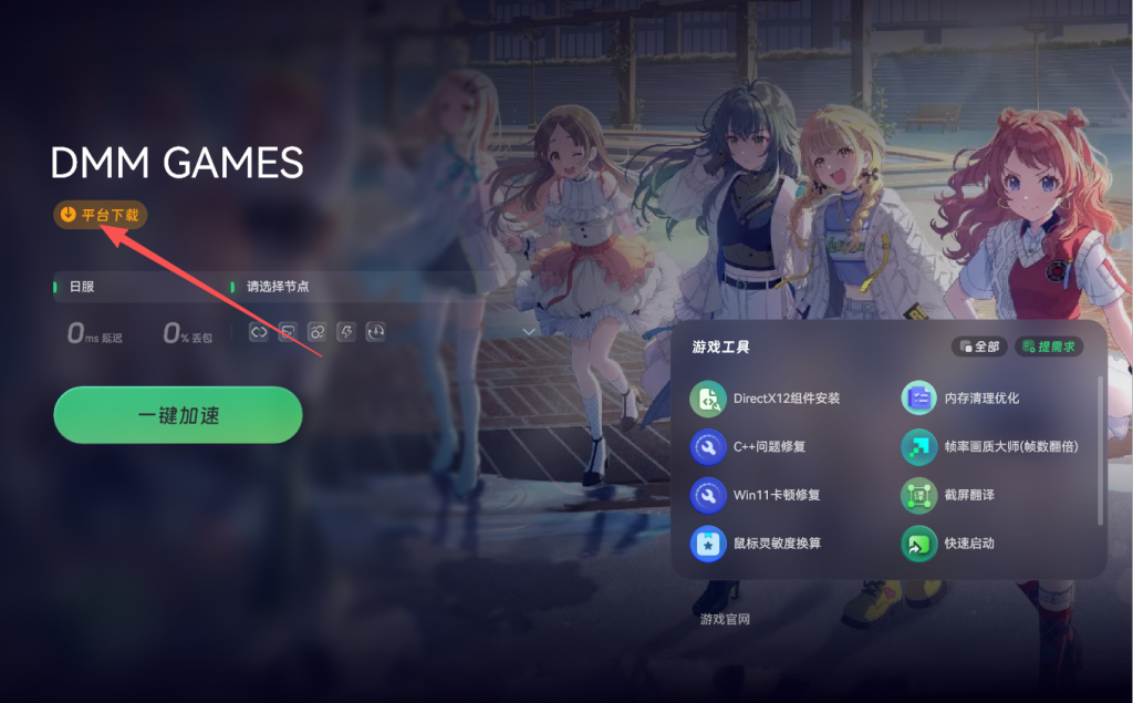 注册成功后,返回奇游加速页面,点击游戏下载按钮,一键下载DMM平台客户端。