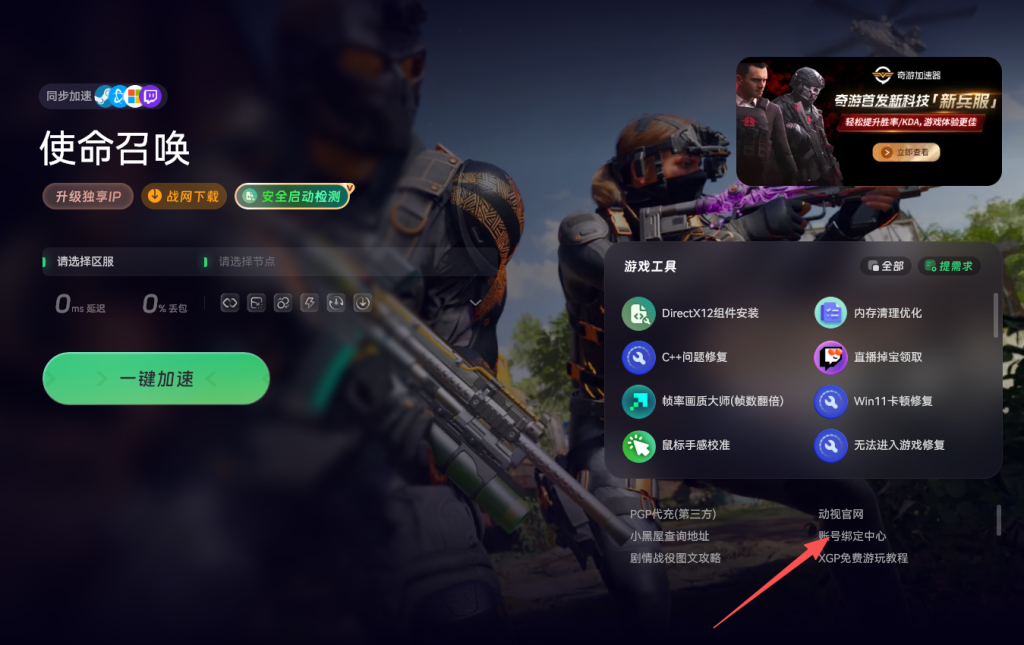 加速完成后,在工具右侧找到账号绑定中心。在这里可以先注册一个动视账号,当然,也可以使用你已有的其他平台账号登录。