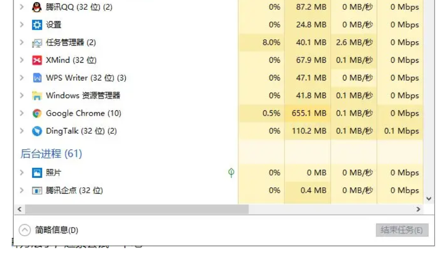 - 按下 “Ctrl+Shift+Esc” 组合键打开任务管理器,在 “进程” 列表中结束浏览器、云盘同步等占用内存较高的程序;