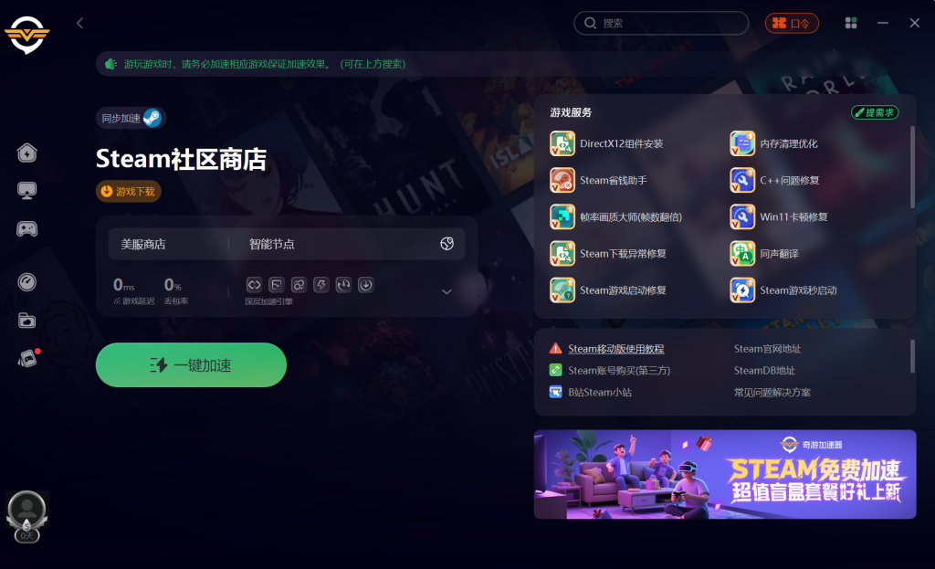“无许可” 问题多源于账户未购买对应游戏,或授权状态失效,具体操作步骤如下:首先打开 Steam 客户端,点击左上角的 “用户名”;在弹出的下拉菜单中选择 “账户明细”,确认是否已成功购买该游戏,若未购买需先完成支付;之后打开奇游优化网络,搜索 “Steam” 并点击一键加速,输入专属口令 qy666,还可免费领取 3 天会员。