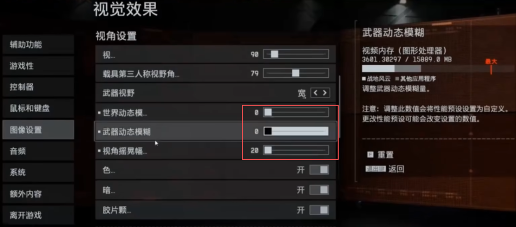 回到图像菜单往下拉,会看到“动态模糊”和“视角晃动”这两个选项,一定把它们拉到最低,不然玩久了容易头晕。
