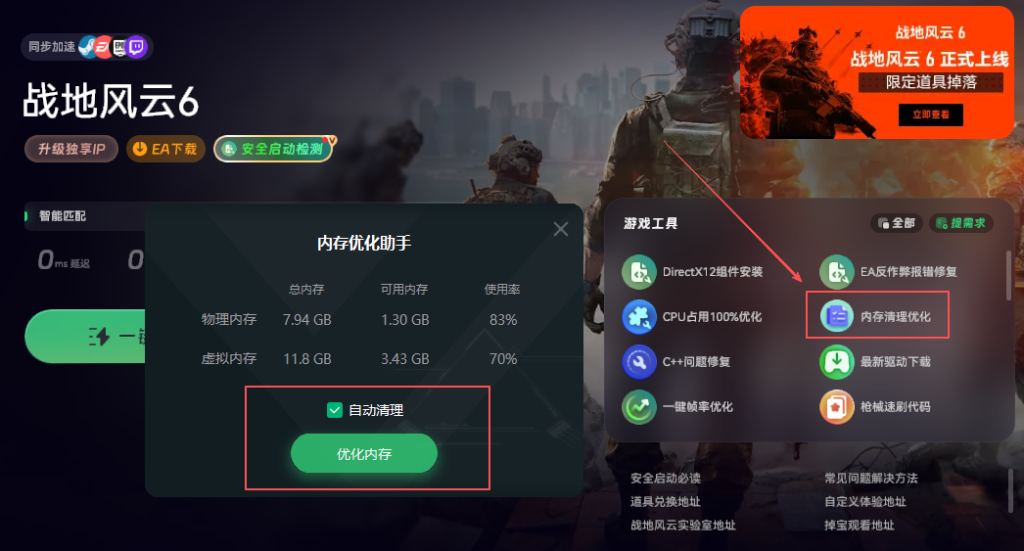 除了游戏内设置,我们还能通过系统优化来提升流畅度。比如可以使用奇游加速工具,搜索“战地6”进行加速。