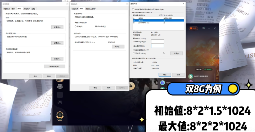 我们在桌面任务栏搜索“高级系统设置”,进入“性能选项”,找到“虚拟内存”设置,选择游戏安装的硬盘,自定义大小,初始值和最大值可以参考一些常用公式来填,一般设为物理内存的1.5倍左右。