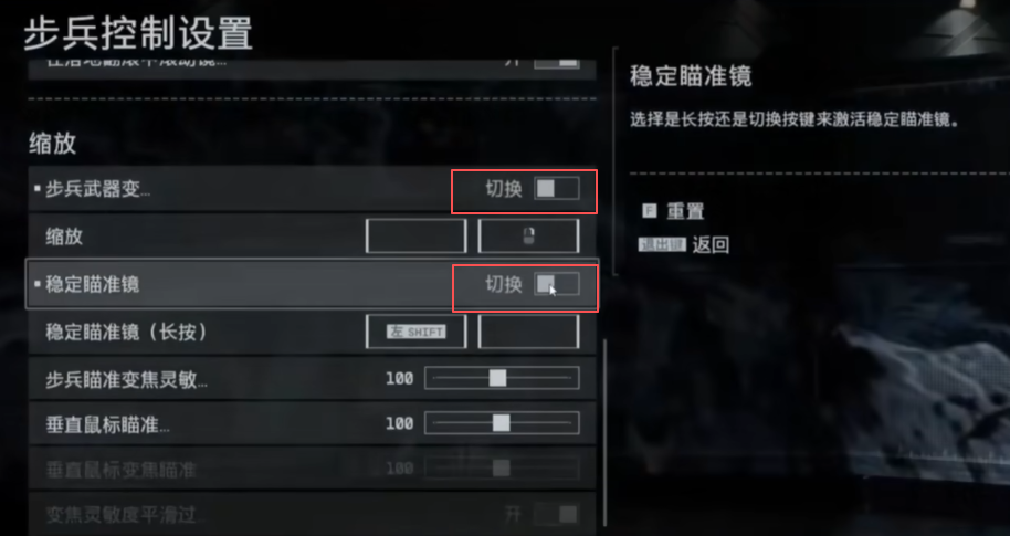 另外“武器变焦”和“稳定变焦”这两个地方,建议都改成“切换”模式,用起来会更方便。