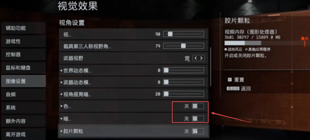 下面的“色差”和“暗角度”也建议关掉。最后记得把“垂直同步”关闭,这样能减少画面延迟。