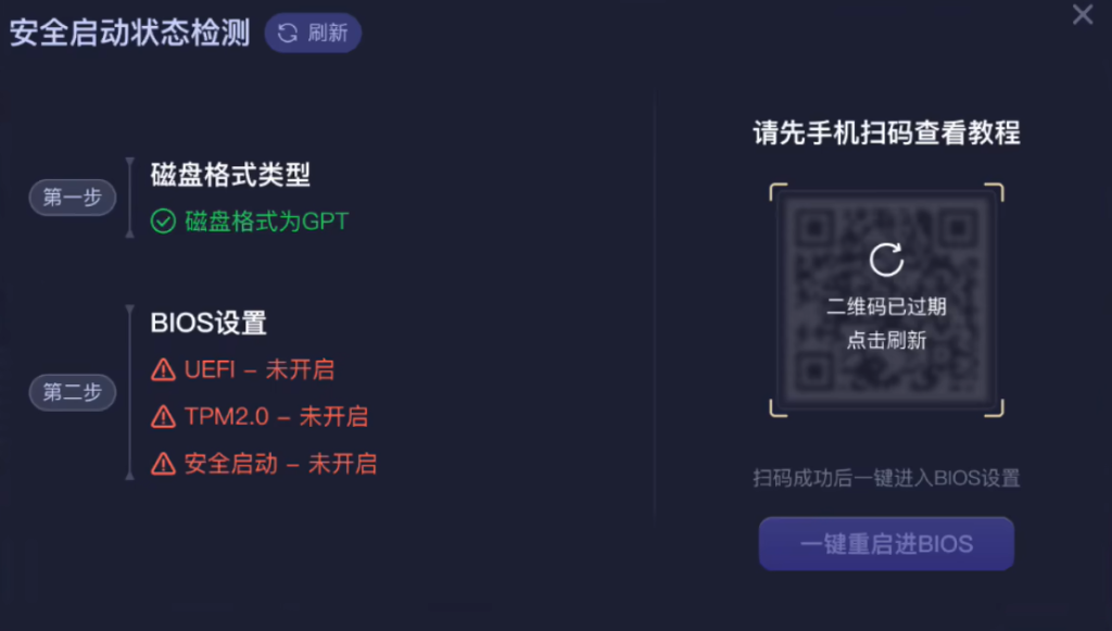 等待检测工具完成检测就能看到电脑设置中存在的问题。大多数玩家遇到的问题是未开启安全启动。点击快捷设置进入,就能看到具体哪一步未开启。