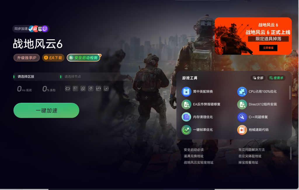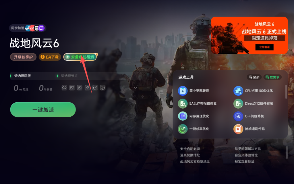 首先需要准备一个奇游加速工具。在奇游搜索“战地六”,点击一键加速。加速完成后,点击右侧的安全启动检测工具。