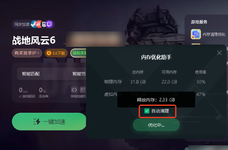 此外奇游加速工具还提供了内存清理优化功能,勾选自动清理选项后会在后台自动清理内存,有效解决卡顿、掉帧和帧数低的问题。